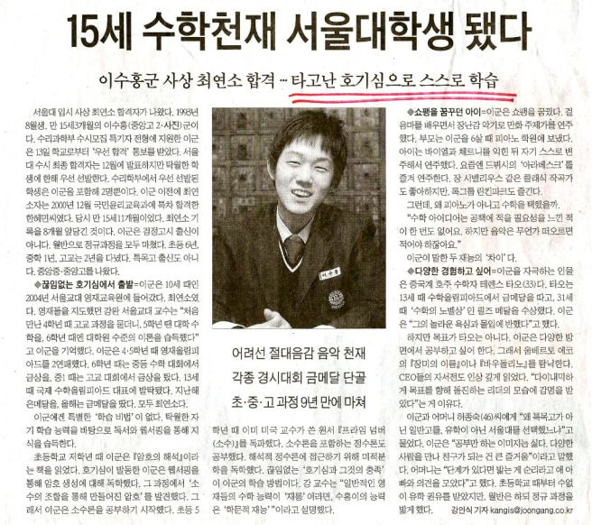 - 15세 서울대 수리/통계학부에 최연소로 입학