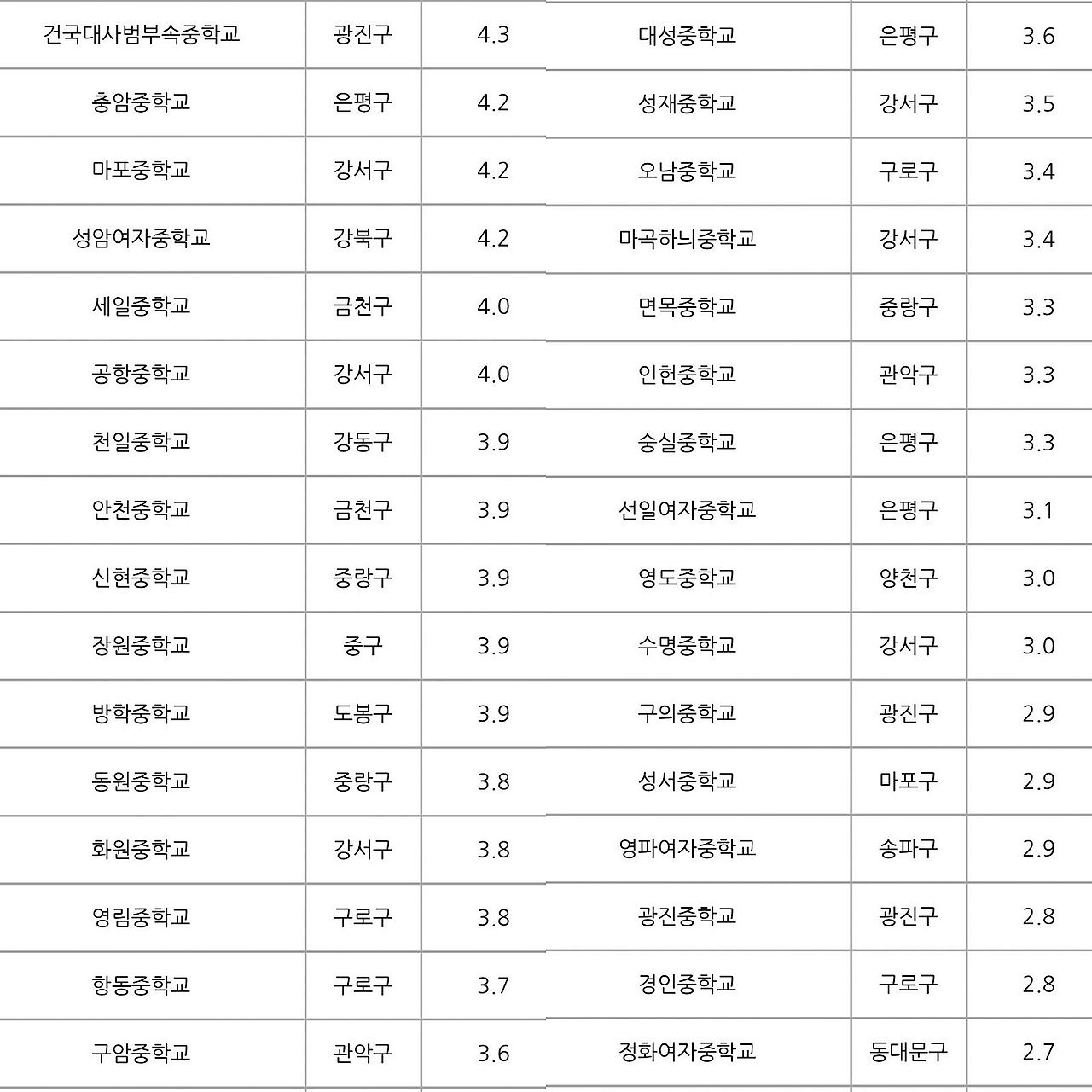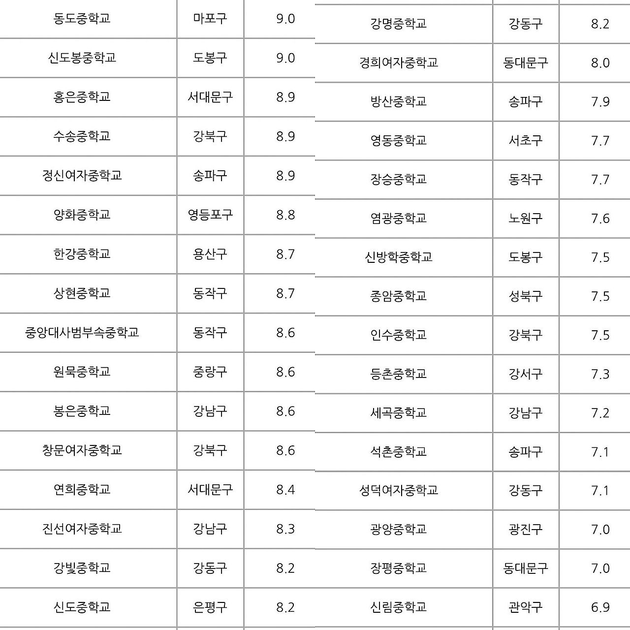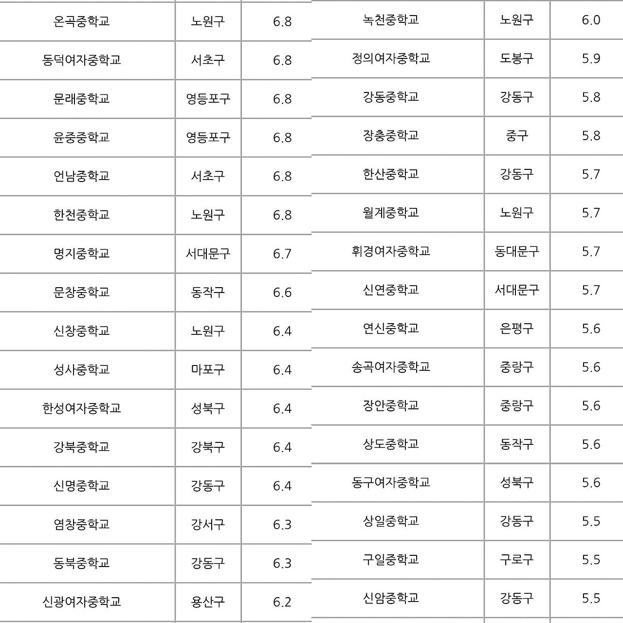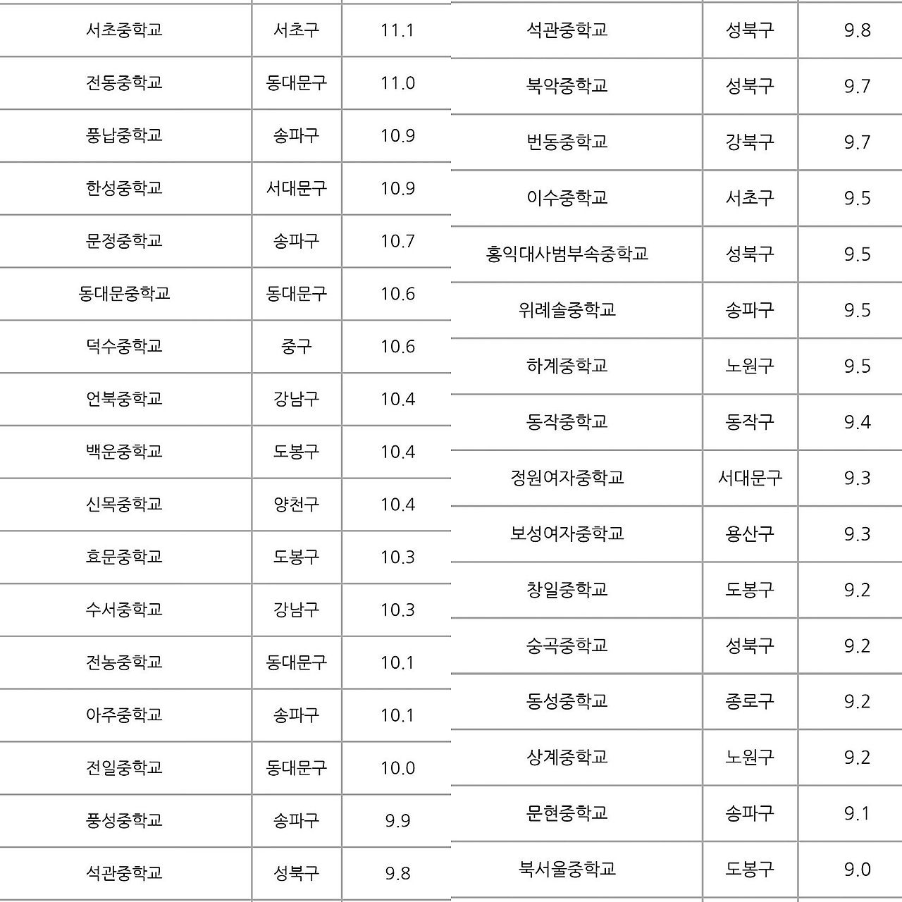 서초구 반포가 일대가 압도적으로 진학률 좋고 그다음 학군 좋기로 유명한 중학교 압구정 중이나 서일중 등등이고